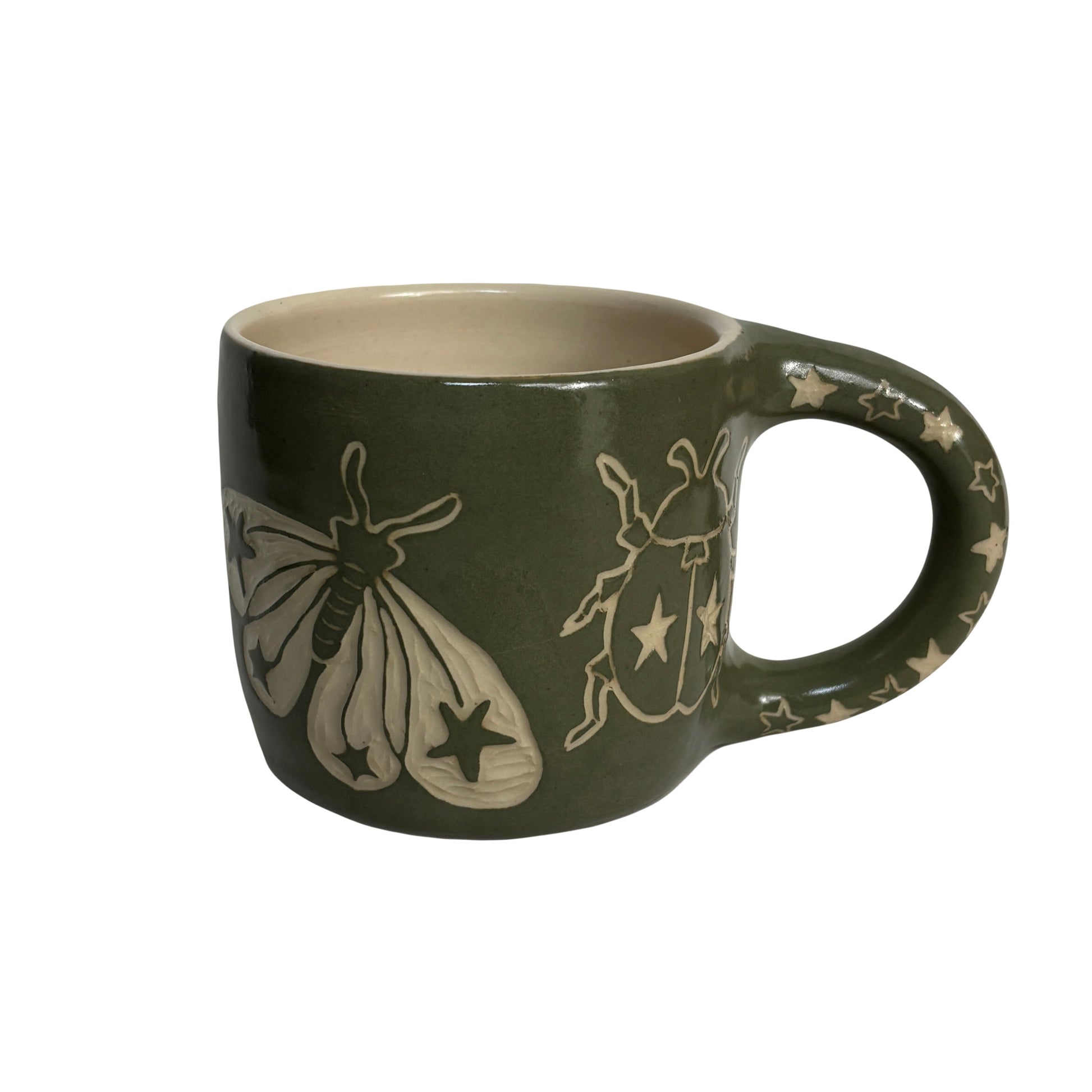 Ceramic cup with hand carved starry insects design.
