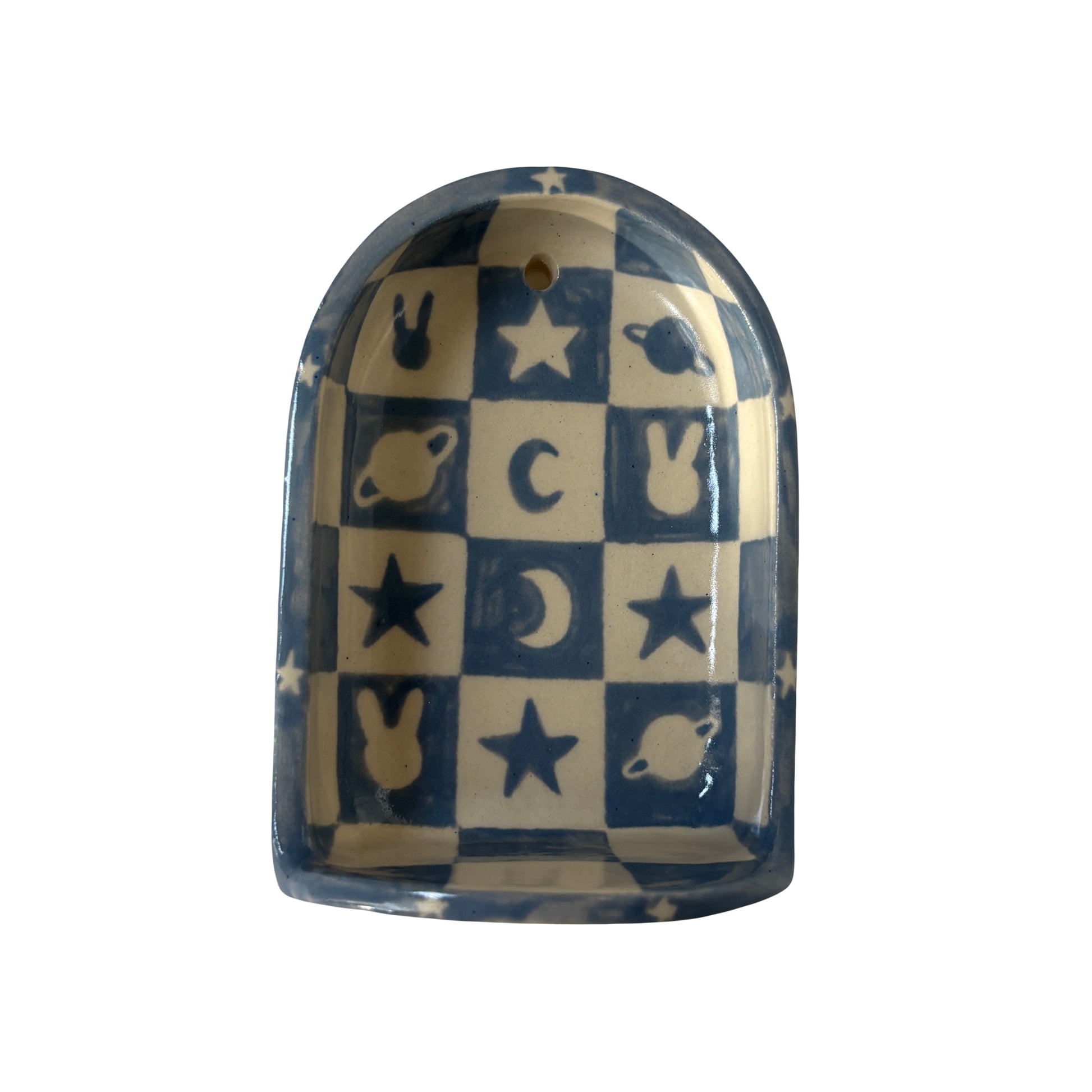 Slate ceramic shelf with checkered space bunny design for holding small candles and trinkets.